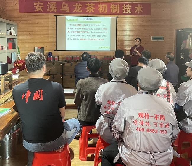 培训会上,茶学系教工党支部书记高水练副教授、茶学系教工党支部副书记薛志慧副教授、福建省科技特派员林馥茗同志以及安溪县农业农村局张炳铃高级茶艺师,就有机肥示范推广技术、安溪县茶园生态改造提升措施、安溪乌龙茶初制技术、食用农产品承诺达标与一品一码追溯并行关键点控制四个主题进行科技分享和专业阐述。系列科技报告后,支部党员带领参加培训人员到茶园观摩有机肥的科学使用,最后,安溪茶学院党委副书记张云帆作总结点评。