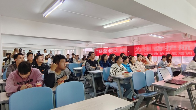 理论学习环节,教学人员结合PPT演示、现场问答等方式,给学员们传授急救相关知识和技能。