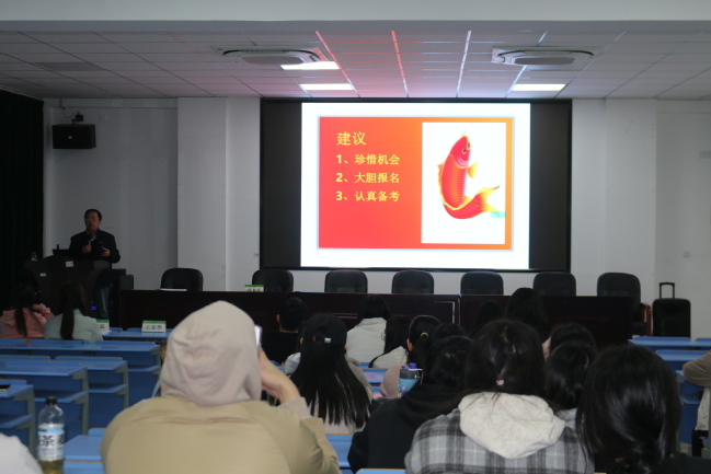 会上,郑龙章从当前的就业形势入题,为同学们分析了选调生报考背景,详细讲解了选调生与公务员的区别、选调生的培养目标、报考条件和录用人数等方面的信息,帮助同学们加强了对选调生政策的了解。郑龙章还鼓励同学们珍惜机会、积极报名、认真备考,勇于投身基层、服务基层,发挥才干,为基层建设与社会发展做出贡献,为成为可靠的领导干部打下坚实的基础。