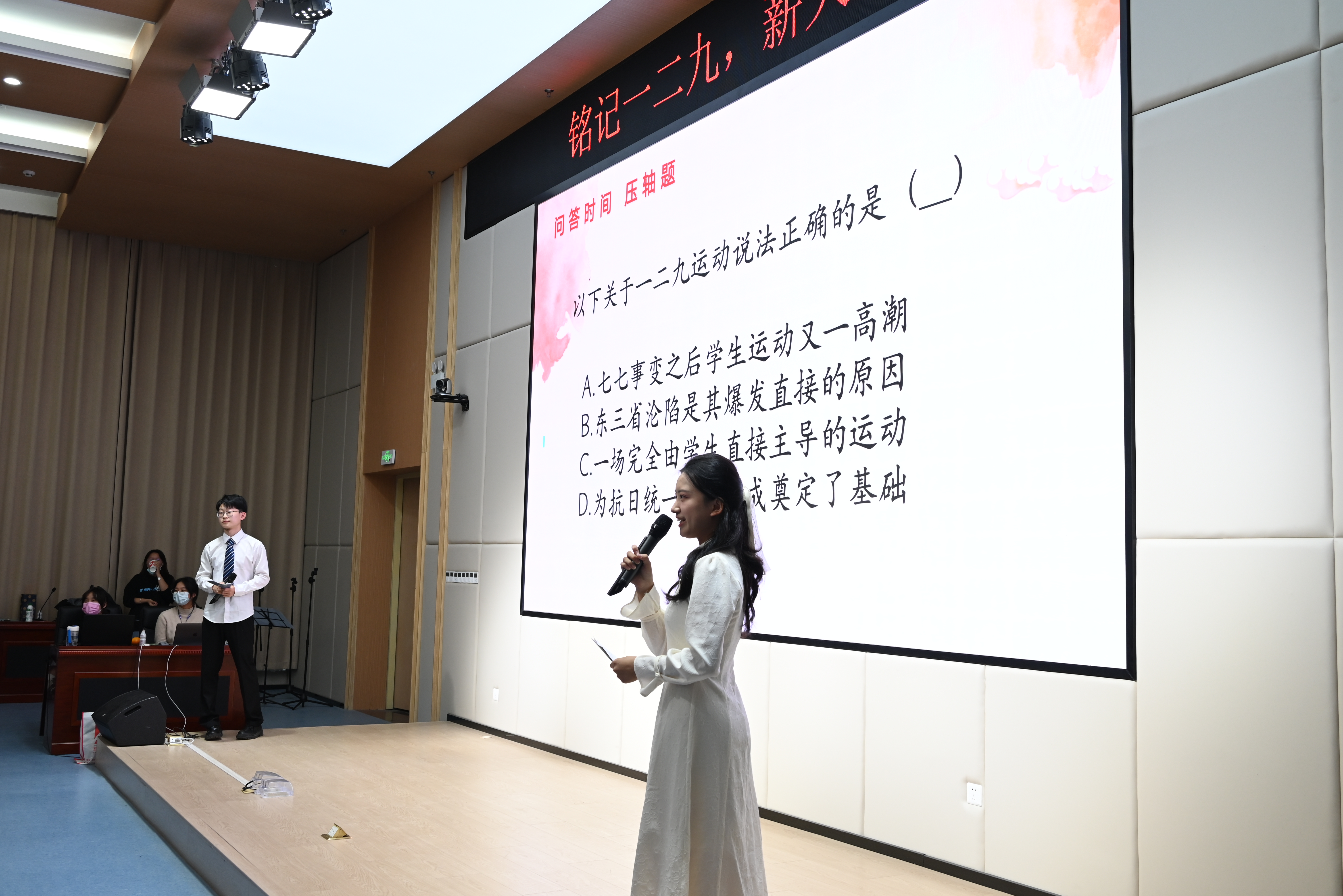 表演节目中场还进行了“一二·九”知识问答环节,帮助同学们普及相关历史知识、传承红色基因,现场观众们踊跃参与,积极答题,气氛热烈。