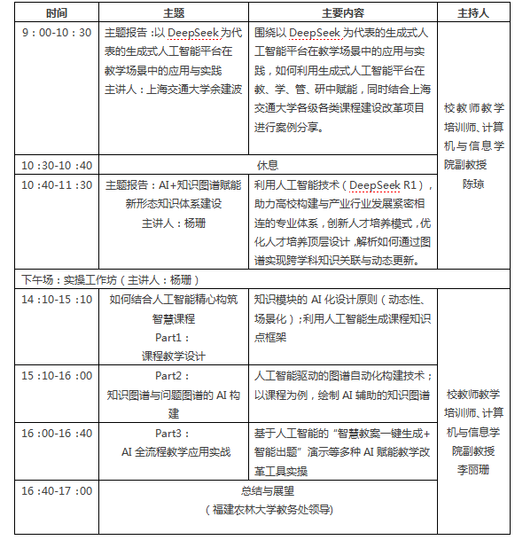 为贯彻落实国家教育数字化战略行动和《中国教育现代化2035》文件精神,迎接人工智能等新技术革命对高等教育提出的机遇与挑战,williamhill英国官网作为以农林学科为特色的综合性高校,亟需将AI技术深度融入教学改革,推动课程体系创新。知识图谱、DeepSeek等前沿技术为教学资源整合、个性化学习设计及学科交叉融合提供了全新路径。本次工作坊旨在响应教育部“人工智能赋能教育行动”,结合学校“四新”建设需求,助力教师掌握AI工具,构建智慧化、场景化的课程体系。