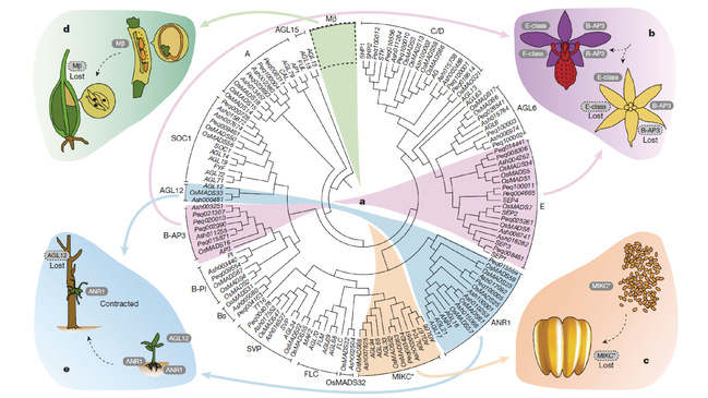 团队解析了兰花花器官的身份认定基因及其调控网络,提出了兰花发育的ABCDE模型。研究揭示了一次古老的全基因组复制事件是现存兰科植物起源的关键驱动力,此后MADS-box基因家族的动态演化直接塑造了兰花的标志性特征。这些发现直接颠覆了“花从辐射对称向两侧对称演化”的传统认知,首次阐明基因丢失成就了兰科植物的花粉块、无胚乳种子、唇瓣等性状和附生习性。从根本上重塑了对兰花繁殖策略和形态建成的理解,修正了自达尔文时代以来的花形态进化经典认知框架。研究成果发表于Nature期刊。