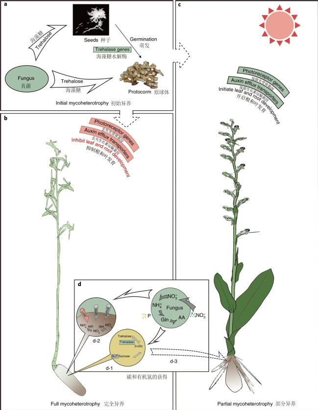 针对植物学百年争议——“兰花-真菌互利共生”传统理论与异养兰花无根无叶生存机制的科学矛盾,团队取得了突破性成果。研究发现兰花通过持续表达海藻糖水解酶基因“劫持”真菌获取营养,保证其可在无根、无叶状态下完成生命周期。这一发现颠覆了植物学教科书“真菌与兰花互利共生”的传统观念,解答了100多年来兰科植物与真菌互作的科学争议。该成果发表于Nature Plants期刊,并入选2022年国家“林草科技十大进展”,被国际同行誉为“开创了兰花利用核基因获取真菌碳源机制的新视角”。