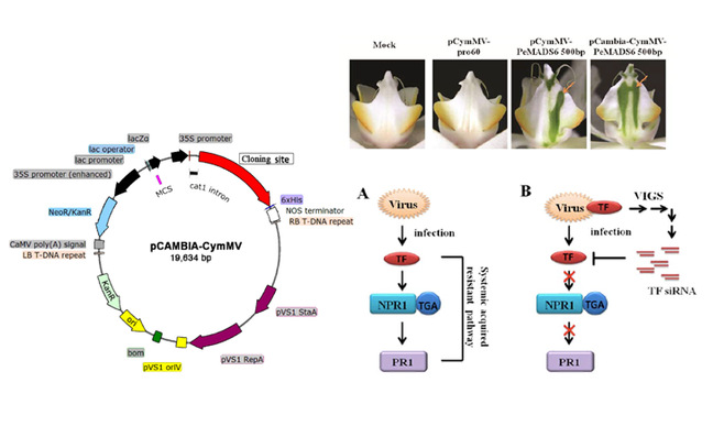 团队首创基于兰花花叶病毒的共生病毒诱导基因沉默技术体系,成功实现目标基因转录水平98%的显著抑制,突破性解决兰科转基因体系技术壁垒。该技术为兰科关键功能基因的快速验证提供核心工具,首次建立适用于兰科植物的分子设计育种平台。