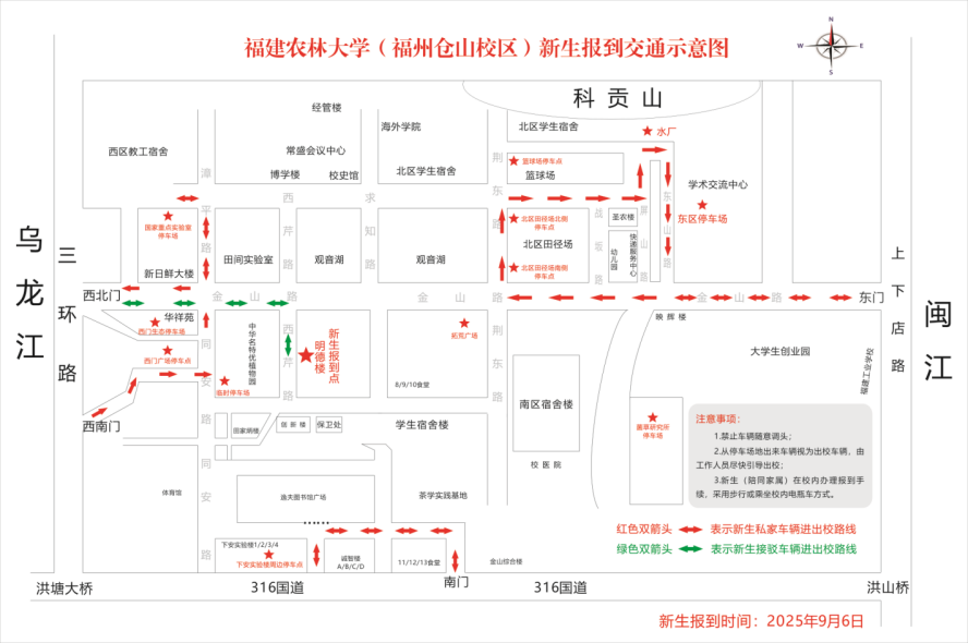为做好2025级新生入学报到工作,报到日当天(9月6日)williamhill英国官网福州仓山校区实行临时交通管控,所有进校车辆须服从学校交通指挥,接送新生报到车辆进出校园按下图线路行驶,敬请支持配合。9月6日零点起,所有进校车辆免收停车费,9月7日零点起车辆收费系统恢复运行。