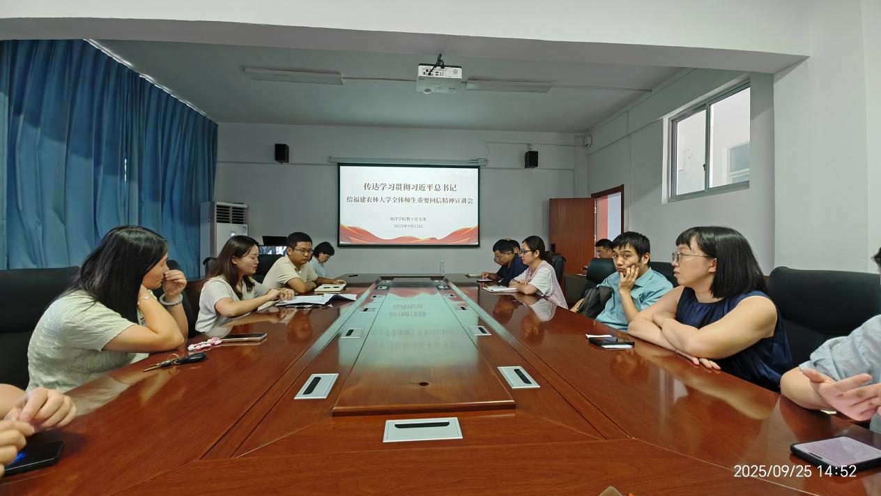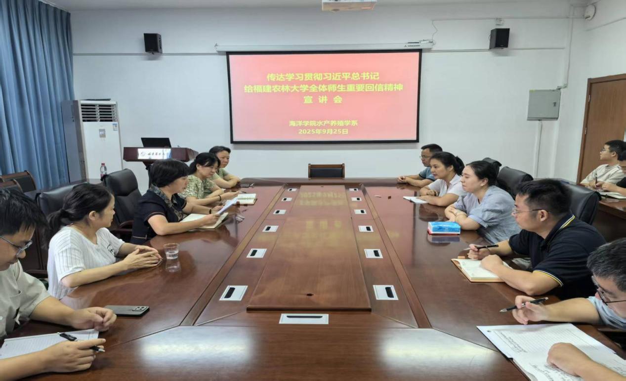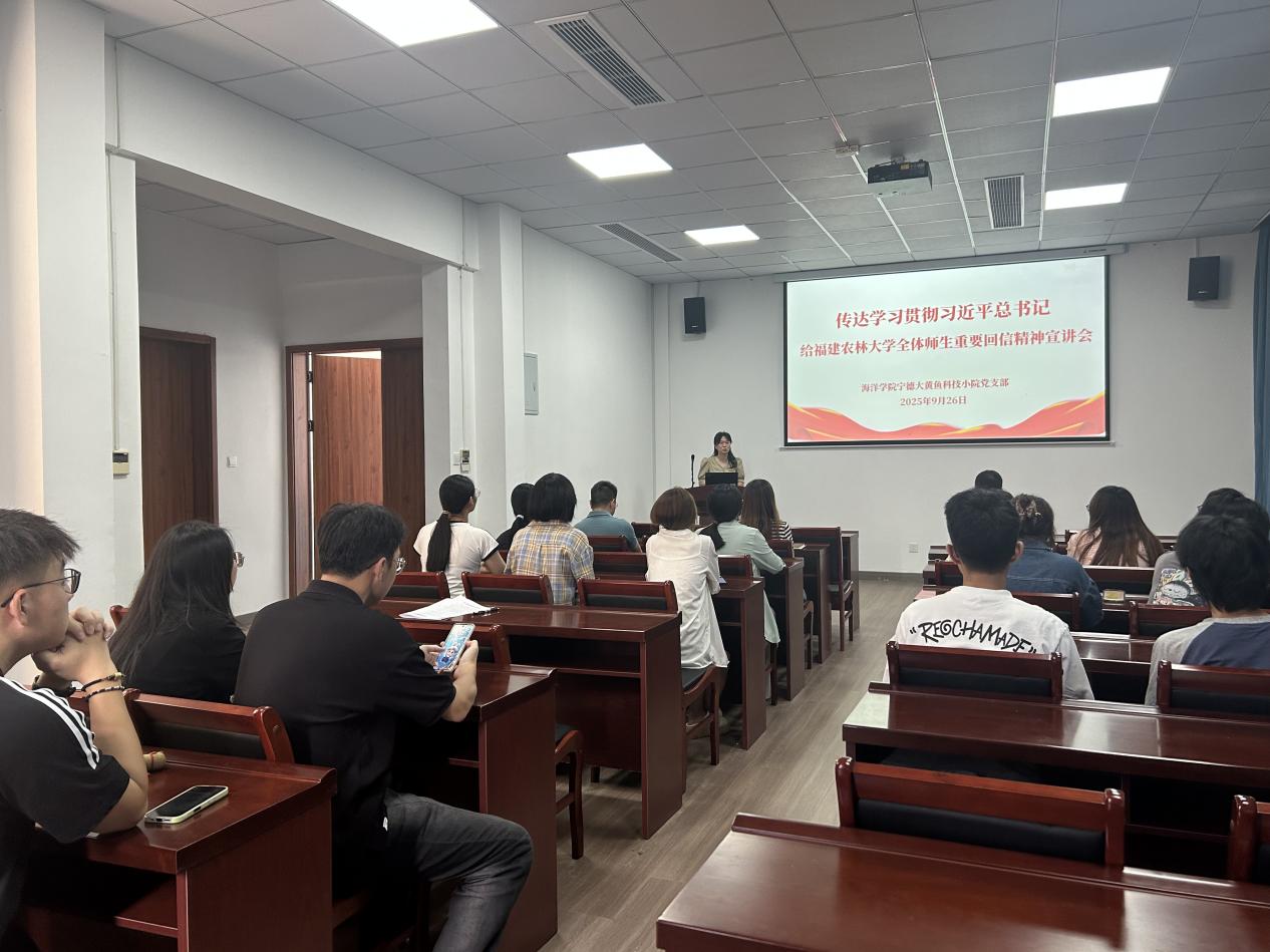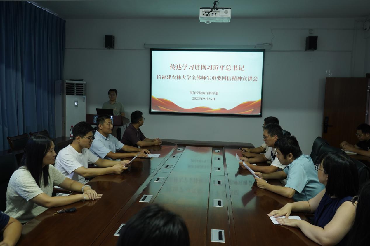 学院领导班子带领师生重温了习近平总书记重要回信原文,传达了省委书记周祖翼代表省委对学校提出的贯彻落实要求,以及校党委关于学习贯彻重要回信精神的相关部署。会议强调,全院上下要深入领会习近平总书记重要回信的重大意义、丰富内涵和实践要求,在深学细照笃行中汲取思想伟力,按照总书记指引的方向坚定不移地走下去。学院全体师生要以重要回信精神为指引,聚焦服务海洋强国战略,紧密结合习近平总书记在福建考察时的重要讲话精神,充分发挥海洋和水产学科的特色优势,“做好海的文章”,在服务国家战略和区域发展中作出更大贡献。全体师生要以立德树人为根本、以强农兴农为己任,努力培养更多懂得海洋、经略海洋、奉献海洋的高素质人才。