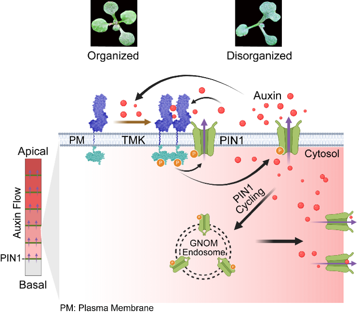 该研究揭示了生长素信号感知与运输的核心耦合机制:生长素转运蛋白PIN1与受体激酶TMK在细胞膜上形成“感知-转运”二元复合体,且该复合体的组装受生长素直接诱导。综合生化、细胞及遗传学证据表明,生长素通过TMK激酶磷酸化修饰PIN1,从而精确调控PIN1的极性分布与转运活性;而磷酸化激活的PIN1通过外运生长素,进一步强化TMK信号通路,在空间布局上形成自我强化“生长素-TMK-PIN1”正反馈循环。该回路驱动从细胞伸长到器官形成等关键发育过程。研究最终阐明,生长素通过整合其信号感知(TMK)与极性运输(PIN1)两大核心模块,构建了一个自组织调控系统,从而维持植物发育的程序与秩序。