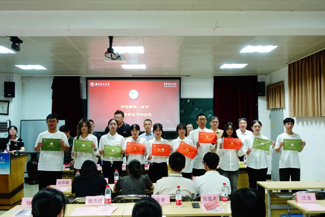 班级代表沈童带领学院2025级严家显创新班全体新生庄严承诺,模范遵守《优良学风班倡议书》,并向学院党委书记余顺兴、院长秦源递交了《建设优良学风班的倡议书》,表达了共同营造优良学风的坚定决心。学院主要领导同时为25级创新实验班授予班旗,学院领导班子成员与与会领导老师为25级严家显创新班班级团支部和班委成员授予学生干部责任旗。