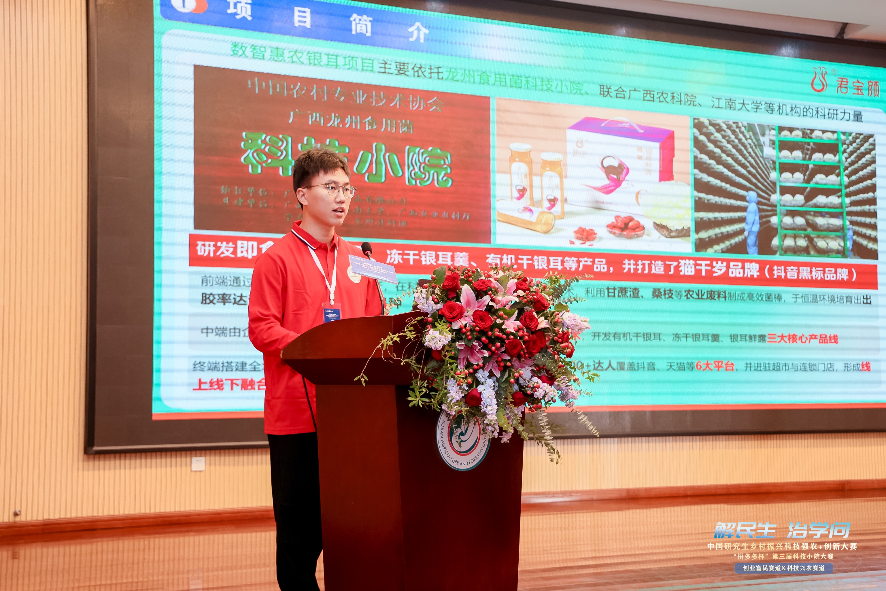 周顺桂代表学校致辞。他表示,学校始终牢记习近平总书记对学校建成“四个基地”的殷切嘱托,与地方政府共建14个地方产业研究院、9个县域乡村振兴研究院和75家科技小院,为乡村全面振兴注入了强劲的“福农力量”。大赛为青年学子搭建了展示成果、交流思想的重要舞台,希望同学们以赛促学、以赛促研,把科技小院的实践经历,升华为服务“三农”的深厚情怀,让青春在乡村振兴的广阔舞台上绽放更加夺目的光彩。