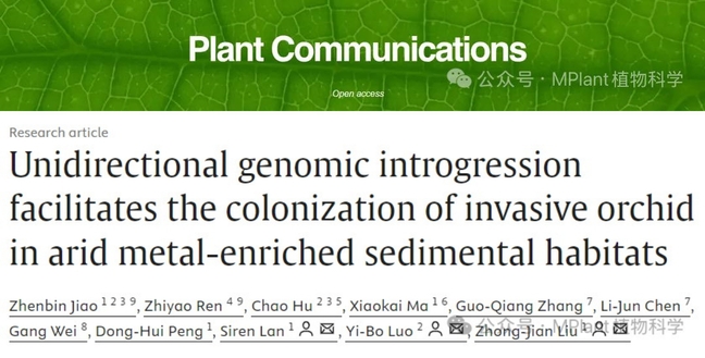 2025年10月13日,Plant Communications(《植物通讯》)在线发表了williamhill英国官网兰思仁教授与刘仲健教授团队及其合作者的研究成果,论文题为“Unidirectional genomic introgression facilitates the colonization of invasive orchid in arid metal-enriched sedimental habitats”(“种间单向渐渗促进兰花入侵至贫瘠且富含金属元素的沉积岩栖息地”)。该研究揭示,铁皮石斛(Dendrobium catenatum,亦称D. officinale)在向东扩散过程中与霍山石斛(D. huoshanense)发生杂交,从而获得了后者在石上附生相关的功能基因。这一渐渗事件使得原本附生于树木的铁皮石斛成功开拓并占据了干旱且富含金属的沉积岩生境。该研究增进了我们对植物种间渐渗在极端环境适应中分子机制的理解。