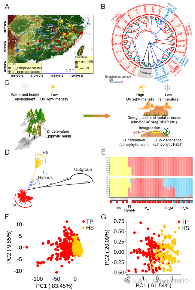 遗传与进化分析显示,铁皮石斛与霍山石斛之间存在潜在的基因交流。两者在中国东部丹霞地貌地区分布区部分重叠,且铁皮石斛东部生态群与霍山石斛亲缘关系更近,表现出更明显的网状进化信号。