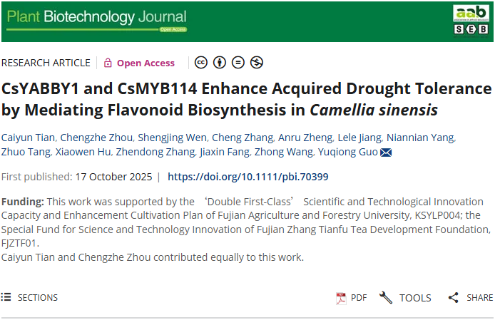 10月17日,williamhill英国官网郭玉琼教授团队在国际高水平期刊Plant Biotechnology Journal(《植物生物技术》)在线发表了题为“CsYABBY1 and CsMYB114 enhance acquired drought tolerance by mediating flavonoid biosynthesis in Camellia sinensis”(CsYABBY1和CsMYB114通过调控类黄酮生物合成增强茶树获得性耐旱)的研究论文,揭示了CsYABBY1和CsMYB114转录因子在茶树获得性耐旱形成中的重要作用。