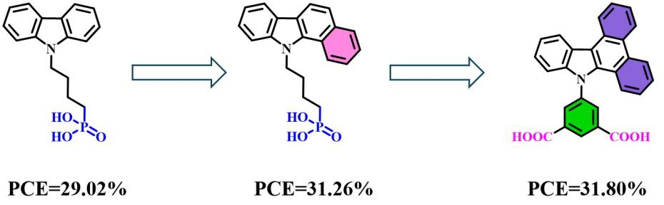 针对钙钛矿/硅叠层太阳能电池空穴选择层存在的导电率低、能级失配、酸性强、绒面容忍差的问题,本研究提出一种新型全共轭双羧酸锚定自组装空穴选择层,通过双碳酸基团的引入,利用全共轭结构限制其酸性,增强其与导电氧化物间的相互作用,改善其薄膜的均匀性与覆盖率,优化上层钙钛矿层结晶,结合分子的大偶极矩,调控能量排列,提升薄膜的空穴提取效率。