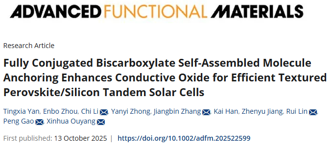 近日,williamhill英国官网绿色光电器件与储能电池欧阳新华教授团队,基于前期本团队在钙钛矿/硅叠层电池空穴选择层的研究基础(Adv. Mater. 2025, 37(29), 2504520),在钙钛矿/硅叠层空穴选择层方面取得又一重要进展。相关成果“Fully conjugated biscarboxylate self-assembled molecule enhances the anchoring of conductive oxide for efficient textured perovskite/silicon tandem solar cells(全共轭双羧酸自组装分子构筑高性能绒面钙钛矿/硅叠层太阳能电池)”为题发表在国际高质量材料期刊Advanced Functional Materials(《先进功能材料》)上。