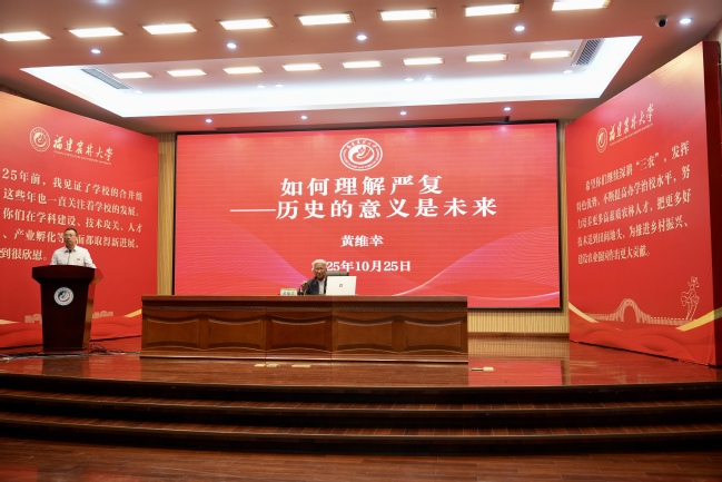 黄维幸作为严复亲属代表致辞。他表示,学校筹建展馆以弘扬先贤精神的举措令他深为感动。谈及科教馆以“严复”命名之深意,他认为,严复虽非严格意义上的农业专家,但其跨越学科的宏观思想与真知灼见,常能为专业领域人士带来意想不到的启示与助益,这正是其思想的宝贵之处。严复作为从福州走出的历史名人,不仅是家族与故乡的骄傲,更是福建乃至全体中国人的光荣。他特别提及严复与台湾深厚的历史渊源,其著作中亦多有对台湾的记述,印证了这份跨越海峡的不解之缘。他期待,严复两岸农业科教馆的建立为深化两岸农业科教交流、增进民族认同注入新动能,为推动两岸关系和平发展、融合发展作出更大贡献。