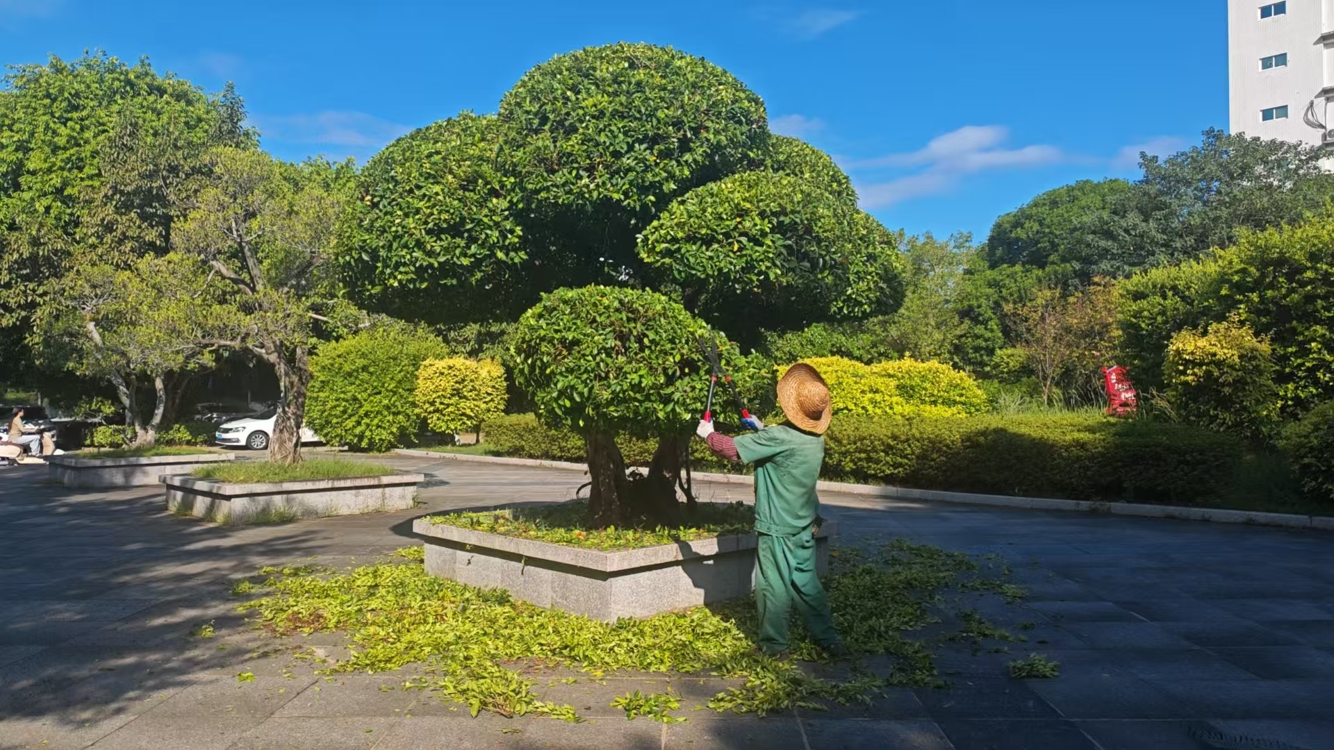 对明德楼、创新楼、田家炳楼的造型绿植开展精细化修剪,凸显绿植结构美,重塑景观线条,优化校园视觉环境。