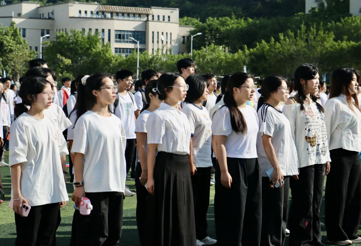 方阵入场后,升旗仪式正式开始。国歌奏响,旗手振臂扬旗,全体师生及领导面向国旗庄严肃立,行注目礼,共唱国歌。