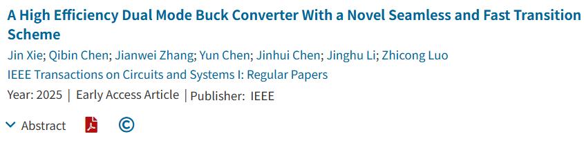 针对这一核心需求,李景虎、罗志聪教授团队近日在电路与系统领域顶级期刊《IEEE Transactions on Circuits and Systems I: Regular Papers》发表题为 “A High Efficiency Dual Mode Buck Converter With a Novel Seamless and Fast Transition Scheme”(一种具有新型无缝快速过渡方案的高效双模降压转换器)的研究论文。该研究提出的双模降压转换器不仅具备高能量转换效率,更通过创新的无缝快速过渡方案,实现了不同工作模式间的无扰平稳切换。同时,转换器在宽负载范围内展现出良好的动态响应特性,为边缘AI终端等设备的电源管理芯片设计提供了全新解决方案。厦门亿芯源半导体科技有限公司、星网锐捷通讯股份有限公司结合产业实际需求,推动该技术落地产品化,加速科研成果向市场价值转化。