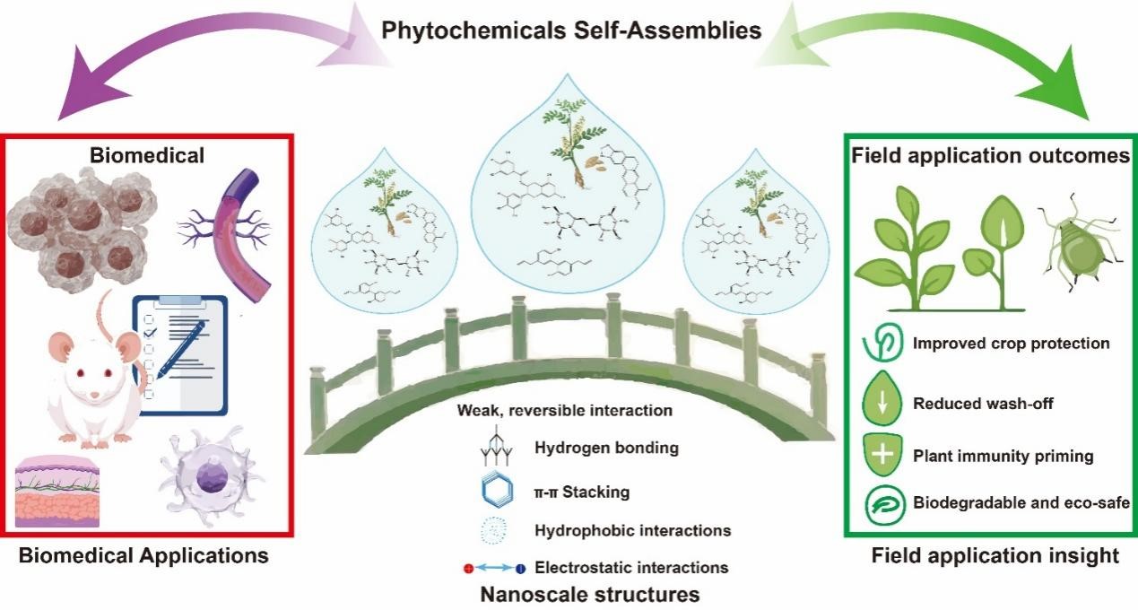 在系统整合了生物医学领域十余年的成熟研究成果后,该综述提出并阐释了“植物化学物质自组装”的概念,即利用植物进化过程中形成的天然防御分子,通过超分子自组装重构其结构与功能,使其既作为活性成分,又作为结构构建单元,形成兼具功能性与结构稳定性的纳米体系。该研究强调,与传统载体型纳米农药不同,植物化学自组装体系具有“从植物中来、为植物服务、最终回归自然”的闭环特征。研究团队认为,植物化学自组装纳米体系不仅是一种新型材料设计策略,更代表了一种融合纳米科学、植物化学与可持续农业理念的系统性解决方案,有望为绿色农业和粮食安全提供长期支撑。