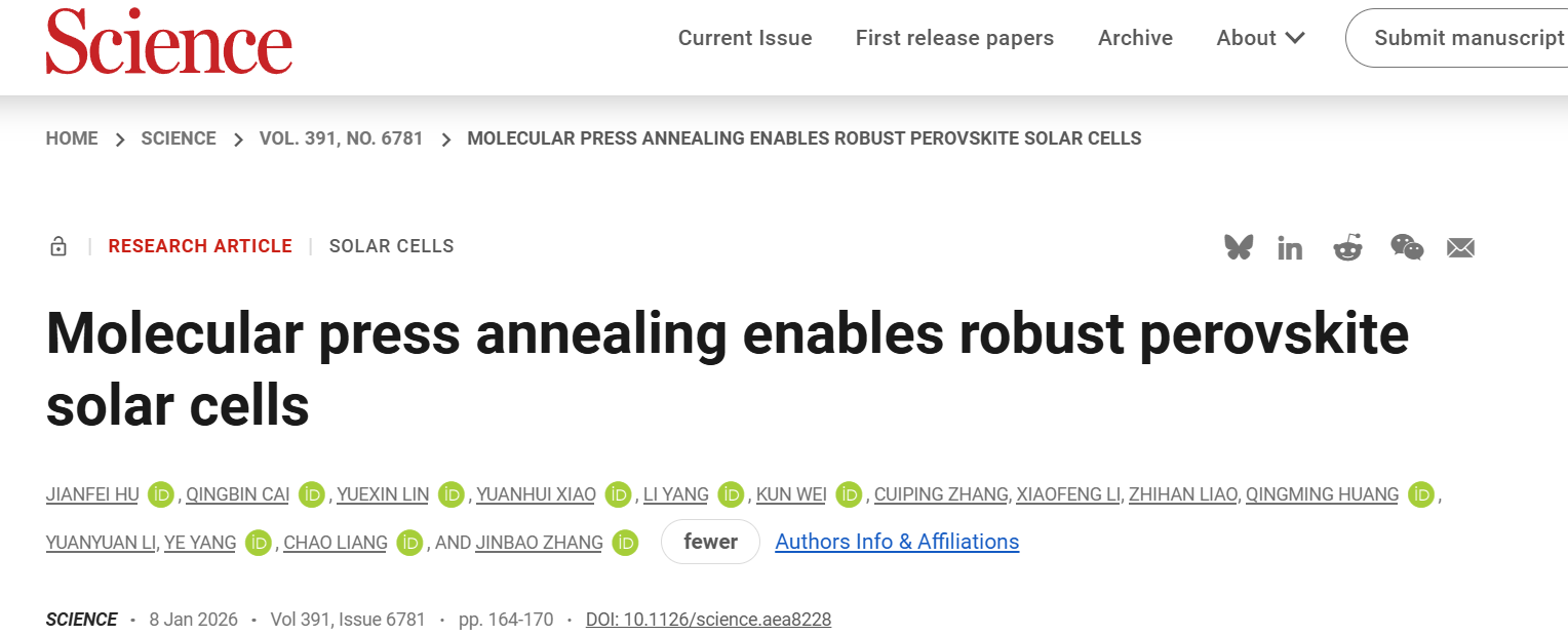 北京时间2026年1月9日,williamhill英国官网数字经济学院绿色光电器件与储能电池团队青年教师蔡庆斌以共同第一作者在国际顶尖学术期刊《科学》(Science)发表题为《分子压印退火实现高稳定性钙钛矿太阳能电池》“Molecular press annealing enables robust perovski...