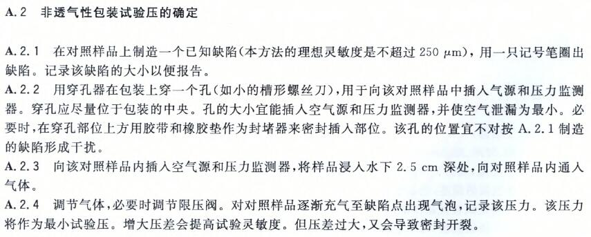 1、用穿孔器(如小的槽型螺丝刀或其他适宜的装置)在包装上穿一个空。以便将空气源和压力监测器插入到样品中。穿孔尽量位于包装的中央。孔的大小宜能插入空气源和压力监测器,并使空气泄漏为最小。如有必要,用胶带和橡胶垫作为穿孔部位的封堵器来密封插入部位。
