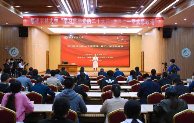 课堂上,林占熺从党的二十大报告提出的“一个中心任务、两步走、三个务必、四个自信、五个‘必由之路’、六个坚持、七个‘安全’、落实中央八项规定精神、中国式现代化的九方面本质要求”等9个方面传达了党的二十大精神;用推进菌草高质量发展阐释党的二十大提出的“科技是第一生产力”“加强生态环境保护”和“构建人类命运共同体”的精神;用自身的经历告诉年轻一代,要始终听党话、跟党走,传承信仰的力量,甘于当隐姓埋名的实干人,到祖国、到人民最需要的地方贡献力量,引导广大师生把思想和行动统一到大会精神上来。林占熺还通过播放视频分享了菌草从福建出发走向世界,让菌草成为全球的幸福草的生动故事,感动了现场师生,全场掌声不断。