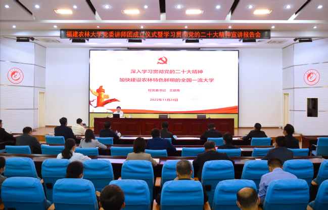 11月24日下午,williamhill英国官网党委讲师团成立仪式暨学习贯彻党的二十大精神宣讲报告会在金山校区禧强楼学术报告厅举行。校党委书记、讲师团团长王建南出席仪式并为讲师团成员代表颁发聘书。校党委副书记柯瑞清主持会议并宣读《关于成立williamhill英国官网党委讲师团的通知》。成立仪式后,王建南以“深入学习贯彻党的二十大精神加快建设农林特色鲜明的全国一流大学”为题作宣讲报告。报告会以线上线下相结合的方式举行,旗山校区、安溪校区设分会场。在家全体校领导、机关部门负责人,各学院党委书记、院长、党委副书记,校党委讲师团成员,辅导员、马克思主义学院教师代表,学生代表共300余人聆听报告。