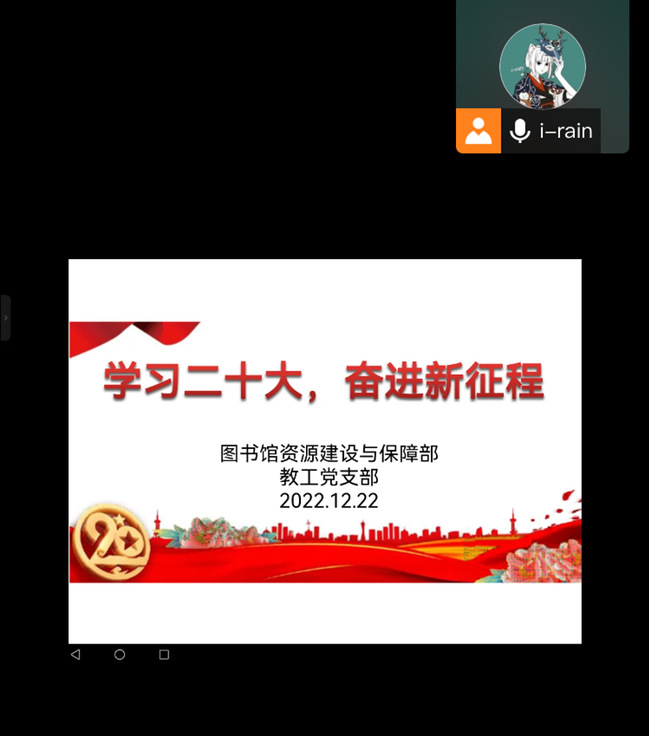 为进一步兴起学习宣传贯彻党的二十大精神的热潮,图书馆党委结合当前疫情防控实际,举办云端系列微党课。支部全体党员参加学习。