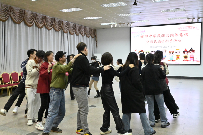 活动紧紧围绕“铸牢中华民族共同体意识”主题,通过素拓和座谈深入开展民族团结进步教育。首先,学生与老师自组队伍共同参与素拓活动,通过两人三足版木头人、背对背运气球、蒙眼丢沙包和听歌猜名四个素拓游戏来增进结对子成员间的感情。游戏结束后,学生代表分享了各自的学习、生活体会,结合自身实际情况,分别从学业、就业、综合素质提升、民族融合等方面进行交流。