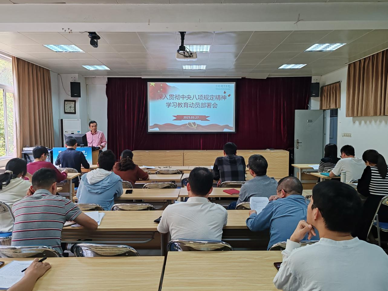 会议学习了习近平总书记关于深入贯彻中央八项规定精神的重要讲话和重要指示精神以及中央、省委深入贯彻中央八项规定精神学习教育有关要求,传达学习了学校党委《关于在全校党员中开展深入贯彻中央八项规定精神学习教育的实施方案》,并对学院高质量开展深入贯彻中央八项规定精神学习教育进行了安排部署。