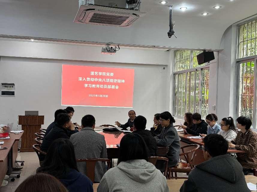 3月28日下午,园艺学院党委召开深入贯彻中央八项规定精神学习教育动员部署会,学院党委委员、纪委委员、党支部书记参加,会议由学院党委书记、院长林金科主持。