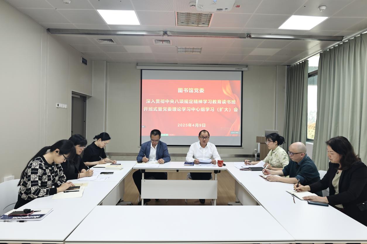 4月9日下午,图书馆党委深入贯彻中央八项规定精神学习教育读书班开班式暨党委理论学习中心组学习(扩大)会在逸夫馆会议室举行。会议由图书馆党委副书记(主持工作)叶扬捷主持,图书馆、信息中心领导班子成员、各党支部书记、科级干部线上线下参加。
