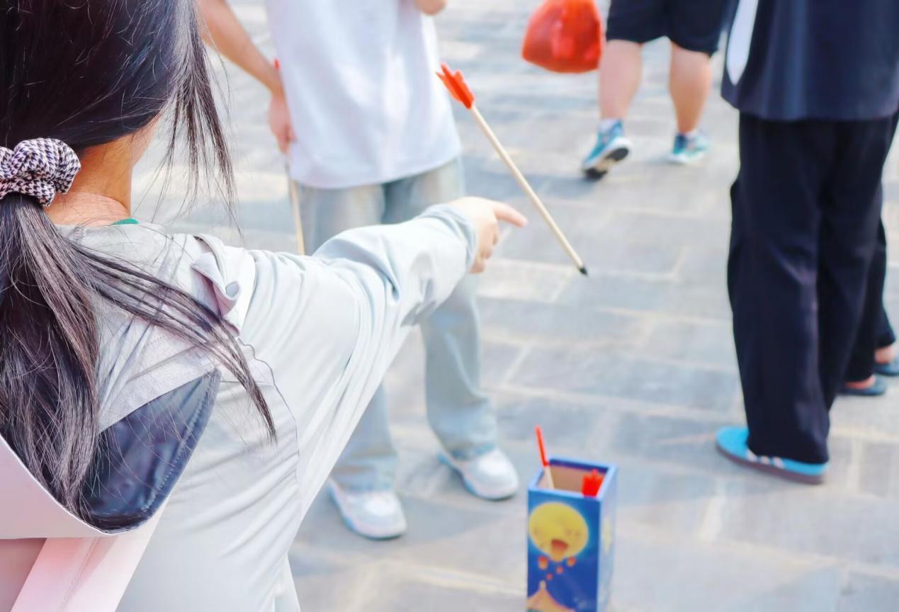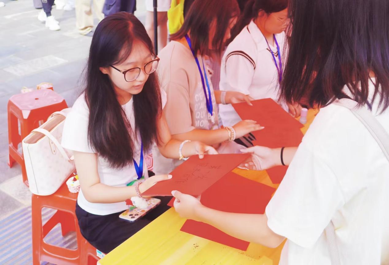 活动中,同学们以集章卡盖章任务为主线,穿梭于各个游戏环节。在“金秋华诞趣投壶”环节,同学们摩拳擦掌,跃跃欲试,凝神聚力间将箭矢信手投入壶中;“月满家国寄心语”活动中,同学们或提笔沉思,或认真书写,用文字表达对祖国的赤子之心;“蟾宫折桂解灯语”活动摊点前排起了长队,同学们开启头脑风暴,你一言我一语地探讨灯谜;“红旗漫卷套福星”游戏深受同学们的喜爱,大家瞄准目标,丢出套圈,在反复尝试中尽享欢乐时光;“红色历史时间线”活动妙趣横生,带领同学们回顾了红色历史,重温峥嵘岁月,增强了“勿忘历史,吾辈自强”的信念感。