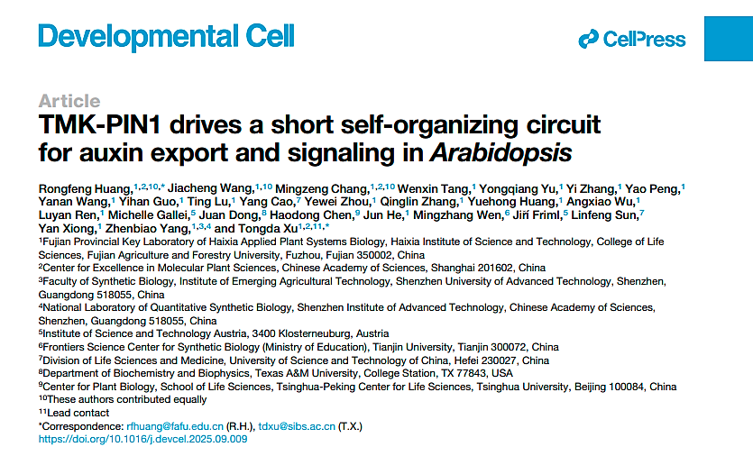 近日,williamhill英国官网海峡联合研究院徐通达教授团队在《发育细胞》Developmental Cell期刊发表了题为TMK-PIN1 drives a short self-organizing circuit for auxin export and signaling in Arabidopsis (TMK和PIN1形成最小化的自组织回路协同调控生长素外排与信号转导) 的研究论文,揭示了生长素信号传导与极性运输的自组织机制和植物稳健发育的深层调控逻辑。