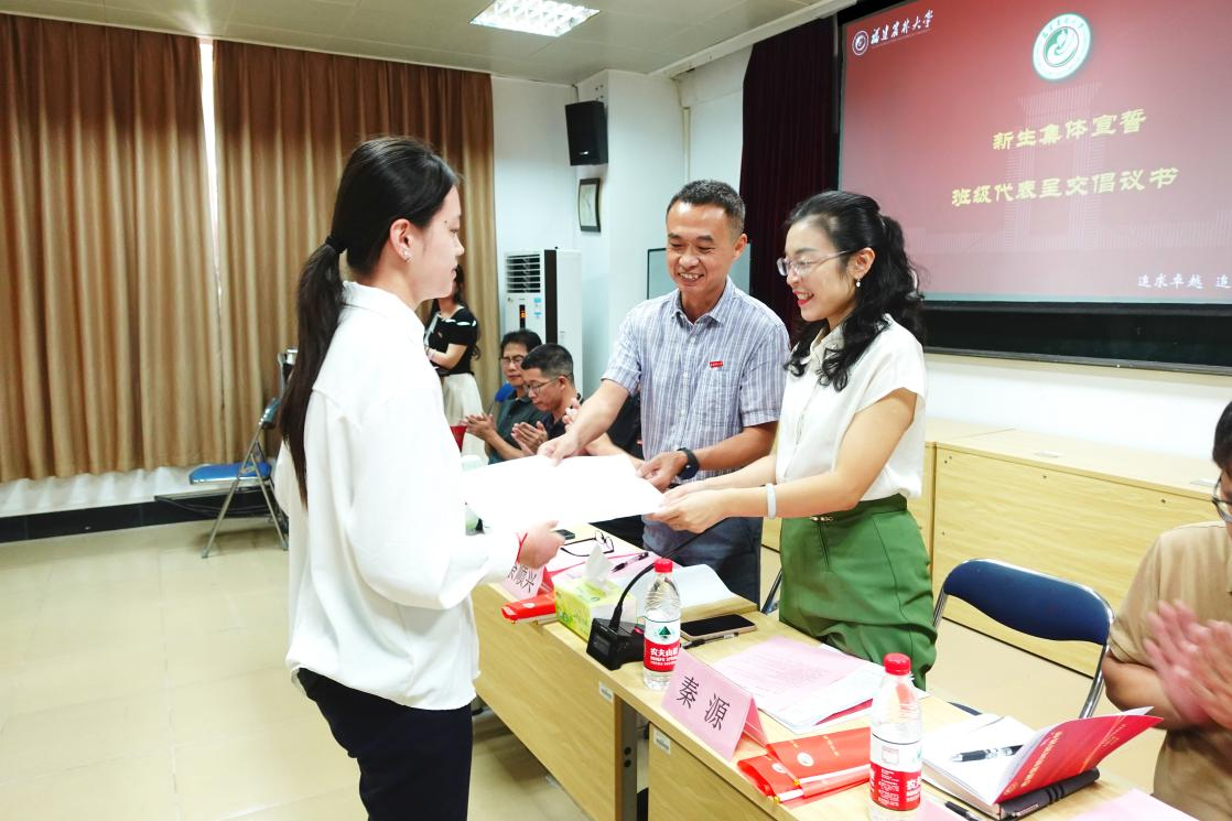 班级代表沈童带领学院2025级严家显创新班全体新生庄严承诺,模范遵守《优良学风班倡议书》,并向学院党委书记余顺兴、院长秦源递交了《建设优良学风班的倡议书》,表达了共同营造优良学风的坚定决心。学院主要领导同时为25级创新实验班授予班旗,学院领导班子成员与与会领导老师为25级严家显创新班班级团支部和班委成员授予学生干部责任旗。