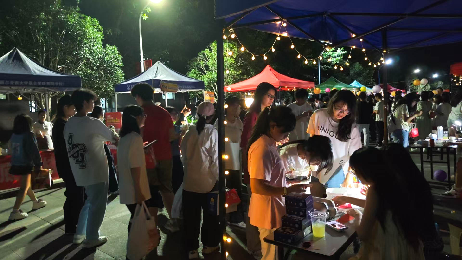 晚风轻拂,灯笼高挂,游园会在温馨祥和的气氛中拉开帷幕。本次活动融合传统与现代元素,设有文艺表演、趣味集章、心愿祈福、国风体验等多个区域,吸引众多学子踊跃参与,现场欢声笑语不绝于耳。在“猜灯谜”“投壶”“月饼制作”等传统游戏区,同学们沉浸式体验古典文化的魅力,与历史对话,感知中华文明的深厚底蕴;“石膏娃娃涂鸦”“九宫格投球”等现代互动项目里,学子们用创意笔触绘出对祖国的祝福,以活力姿态传递青春担当。集章卡领取处和博饼兑换处人头攒动,同学们在完成任务的同时也收获了友谊与快乐。现场人潮涌动,笑声与欢呼此起彼伏。