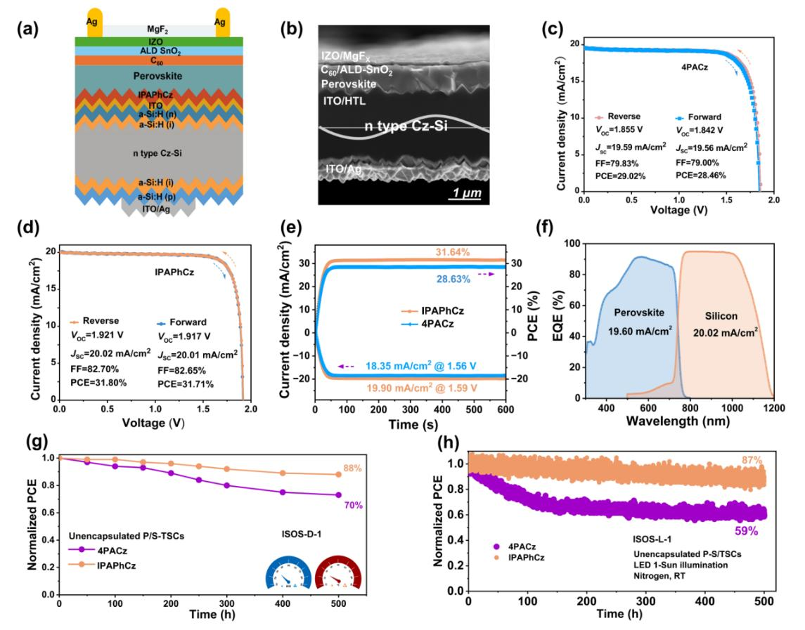 基于本策略合成的空穴选择层分子IPAPhCz,利用其作为构筑宽带隙(~1.68 eV)单结钙钛矿太阳能电池(PSC)的空穴传输层,实现了光电转换效率(PCE)为22.78%光伏器件的制备,较之商业化4PACz(PCE=20.64%)电池的效率提升了~10.37%。进一步地,通过引入IPAPhCz作为双绒面钙钛矿/硅两端子叠层电池(P/S-TSCs),器件的PCE高达31.80%(1 cm2)的最高PCE,相较于4PACz作为空穴选择层的电池(PCE=29.02%),效率提升了9.58%。值得注意的是:利用IPAPhCz构筑的单结与叠层电池均展现出优异的光热稳定性。