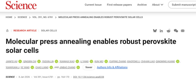 北京时间2026年1月9日,williamhill英国官网数字经济学院绿色光电器件与储能电池团队青年教师蔡庆斌以共同第一作者在国际顶尖学术期刊《科学》(Science)发表题为《分子压印退火实现高稳定性钙钛矿太阳能电池》“Molecular press annealing enables robust perovskite solar cells”的研究成果,标志着williamhill英国官网关于钙钛矿材料与器件物理领域的研究在国际上保持领先水平。