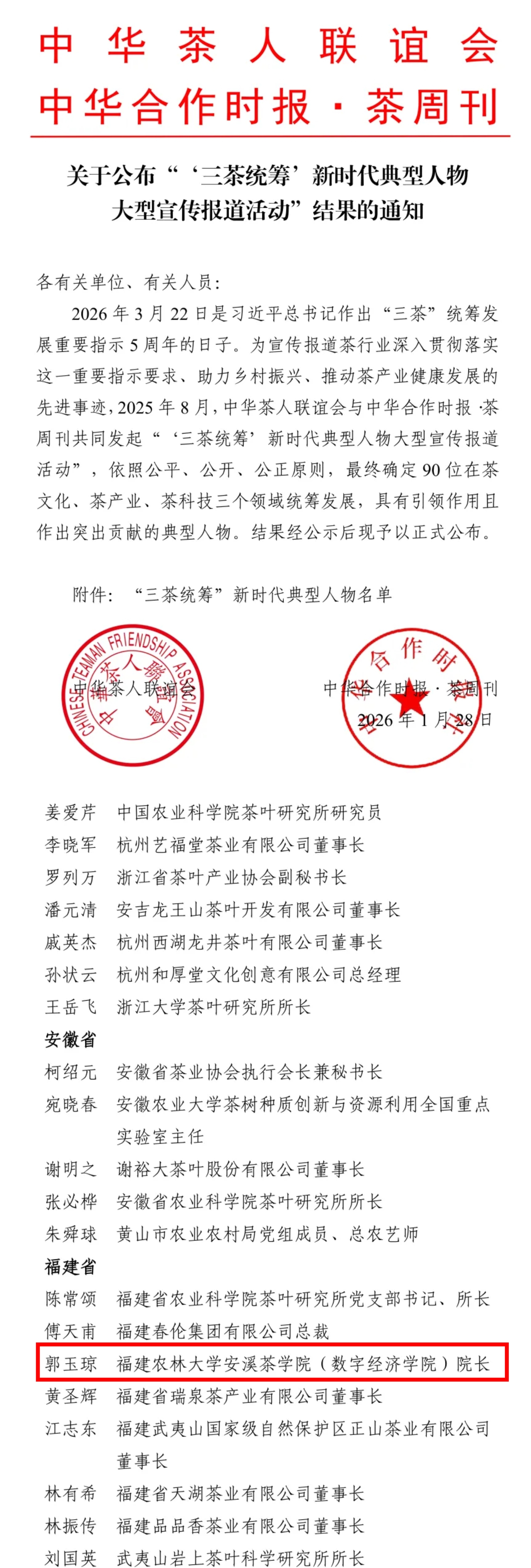 近日,由中华茶人联谊会与中华合作时报·茶周刊联合发起的“‘三茶统筹’新时代典型人物大型宣传报道活动”名单正式公示,安溪茶学院(数字经济学院)院长郭玉琼教授凭借在茶文化传播、茶产业服务、茶学科建设等方面的持续耕耘与实践入选其中。