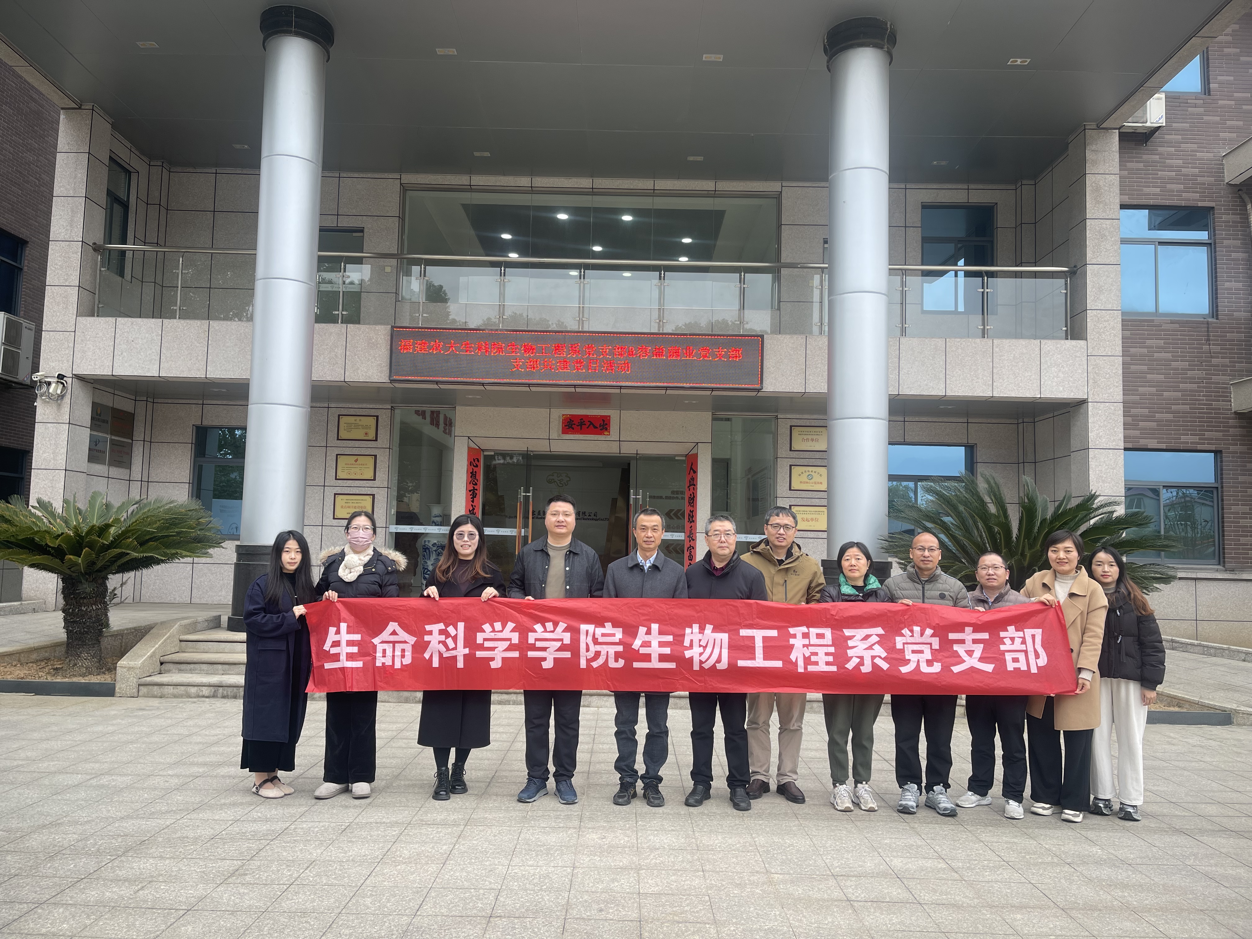 1月28日,生命科学学院生物工程系党支部与福建容益菌业科技研发有限公司党支部联合开展产学研融合主题党日活动。学院党委书记余顺兴、副院长黄天培、生物工程系党支部书记兼系主任傅俊生带领支部成员走进企业,以党建为纽带搭建起校企深度合作的桥梁。